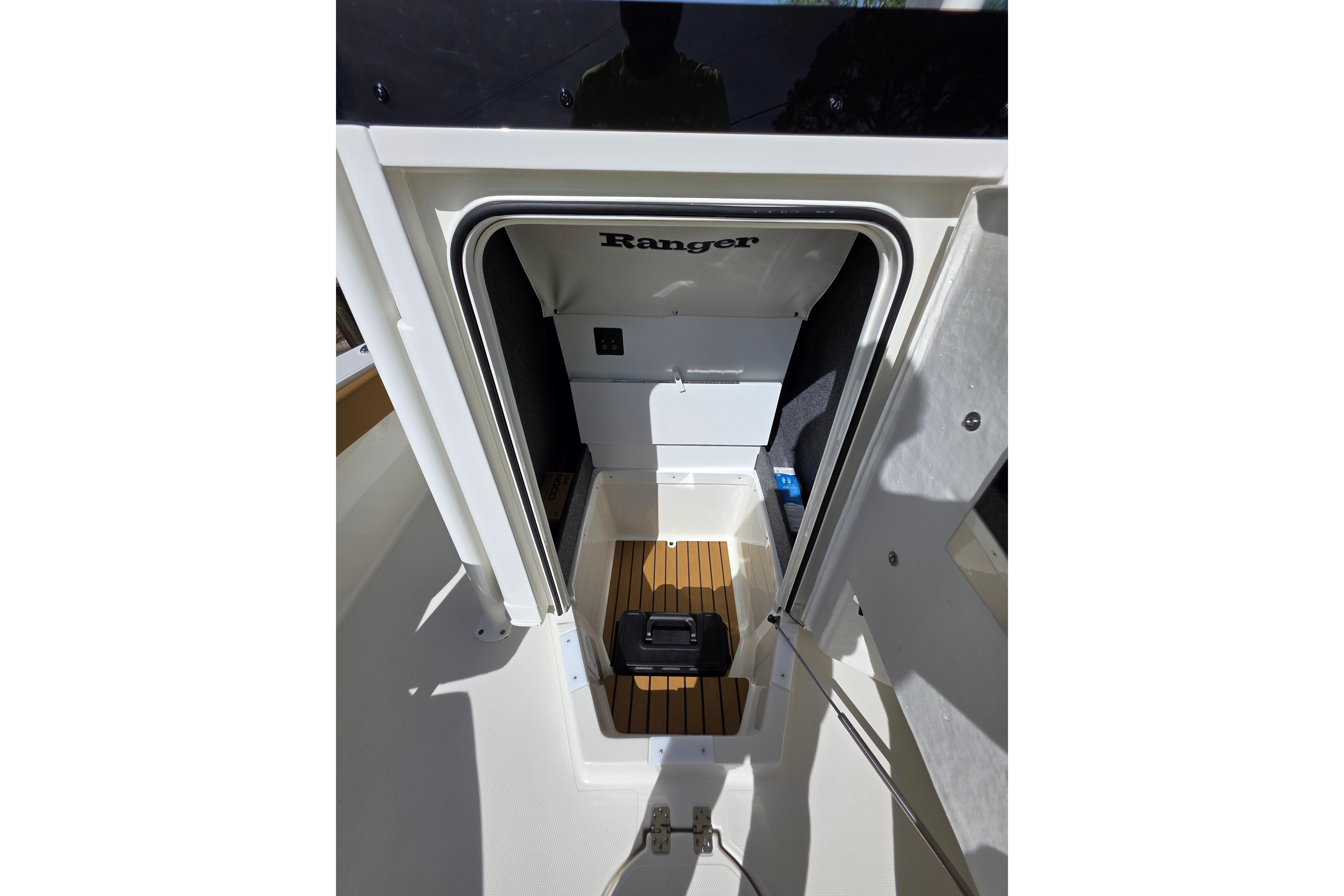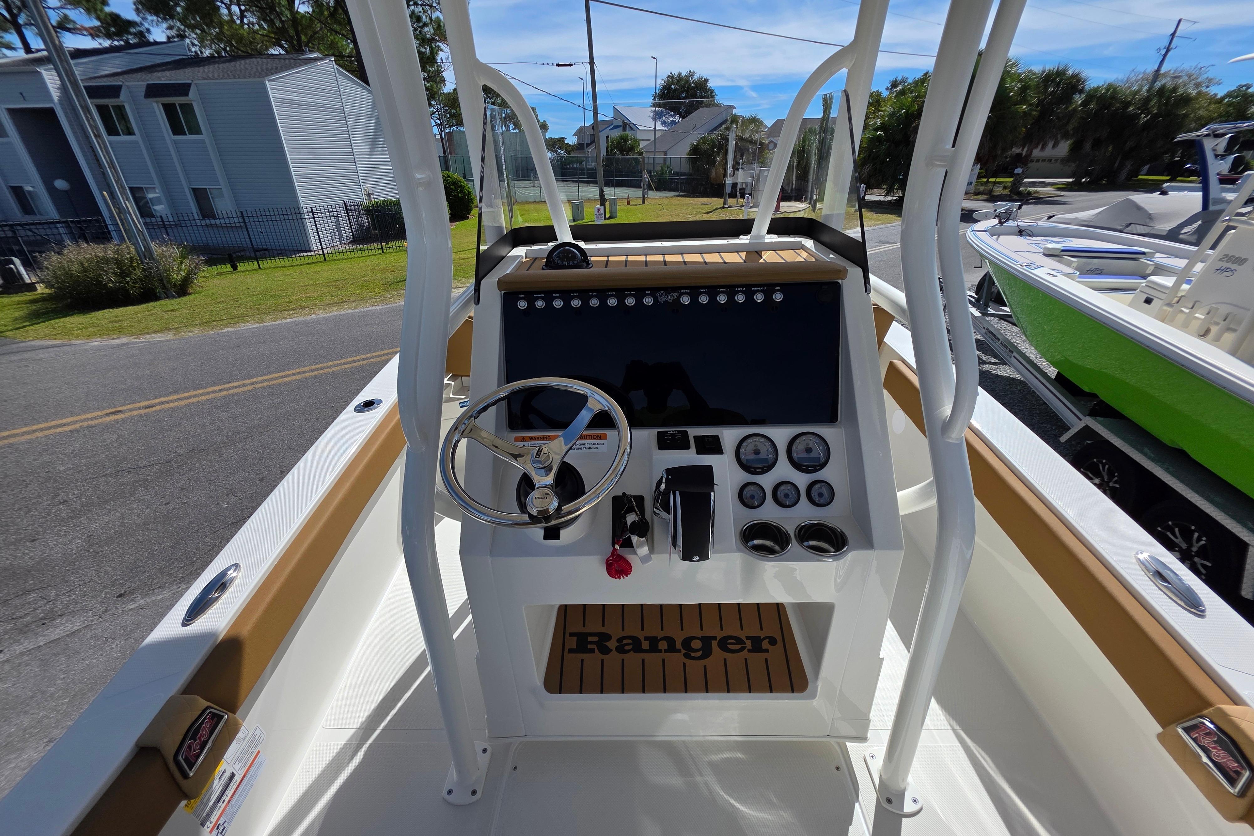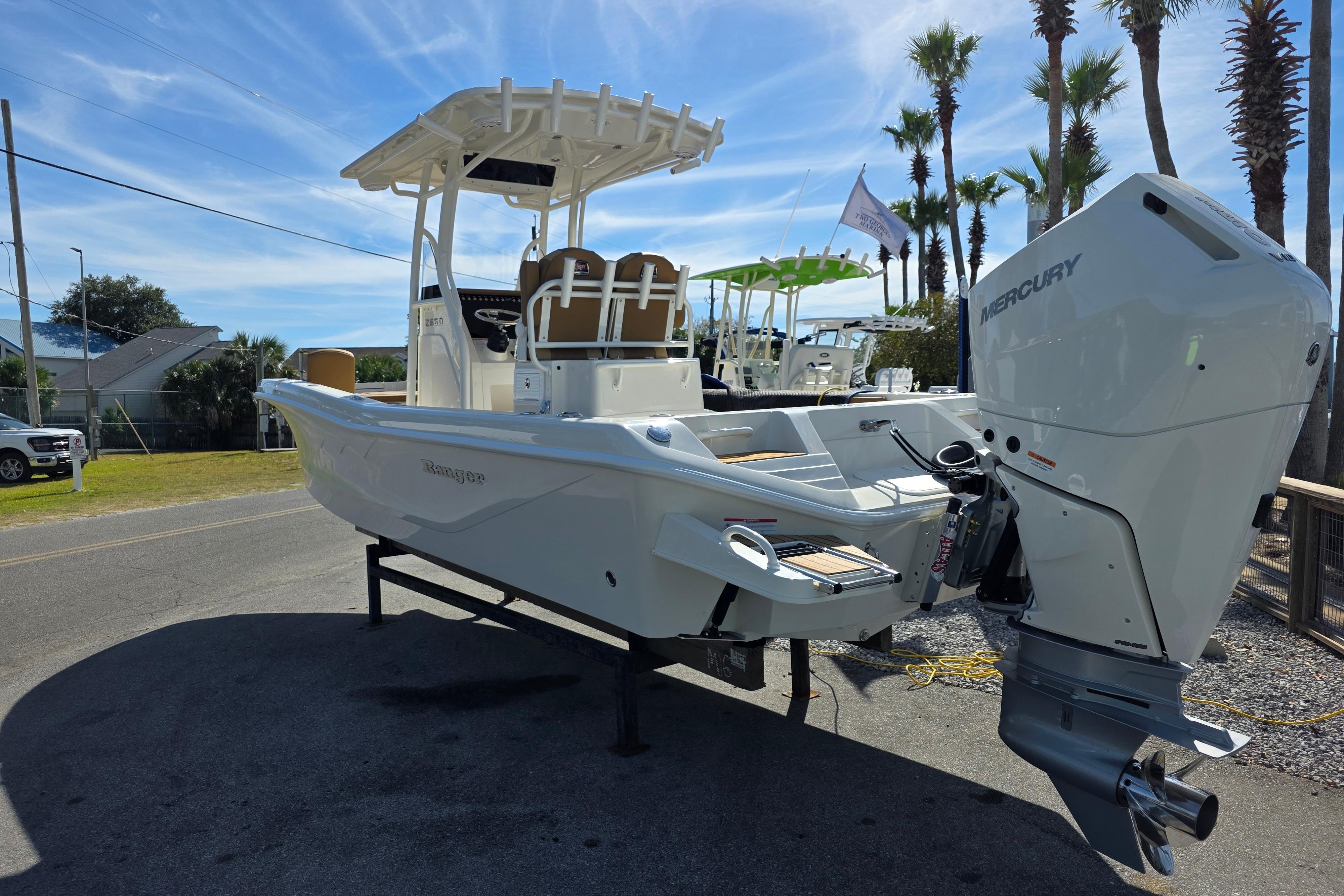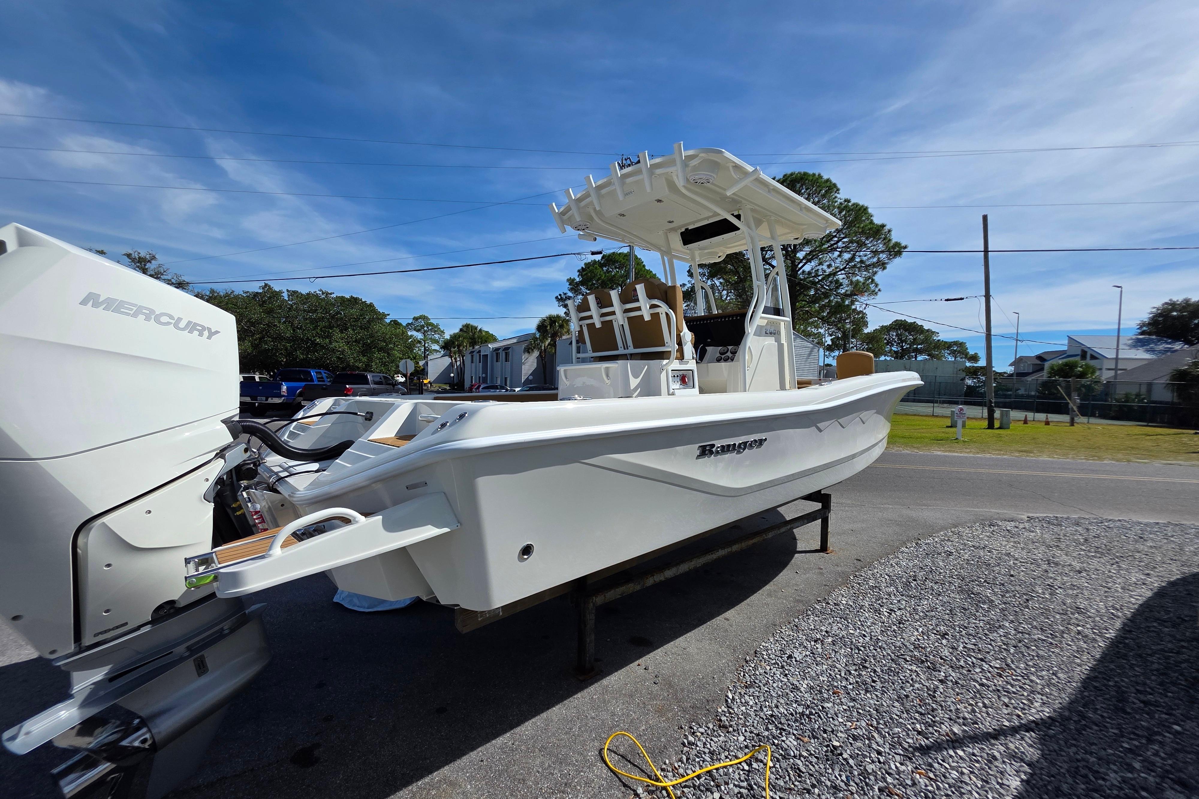The 2660 Bay Ranger builds on Ranger’s sterling lineup of bay boats with a new hull, expanded capability and an extreme attention to detail to deliver incredible performance and fishability to pursue saltwater species around the globe. Twin rod storages and a massive fish box highlight the angler-centric front deck that is ideal for casting jigs or nets. Live bait rides behind the helm seat and/or in the front deck step for quick access to keep the bite going while rod holders throughout keep your gear handy. A rear swim platform and optional front-deck cushions add versatility to the 2660 for a family-oriented outing, but when it’s time to get after the fish the 400-horsepower rating offers excitement on demand. The Ranger 2660 boasts ample muscle for all of your blue water quests.