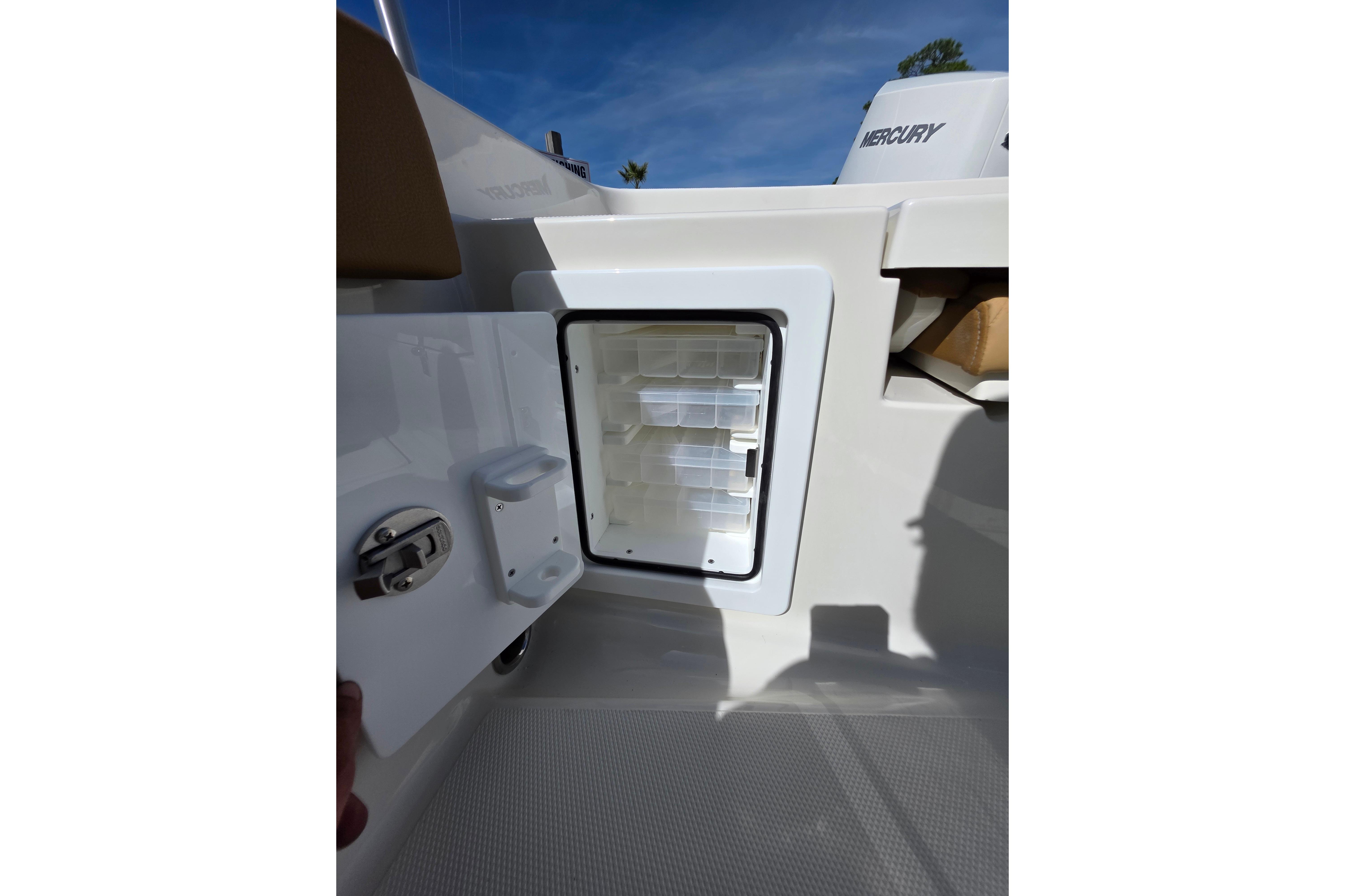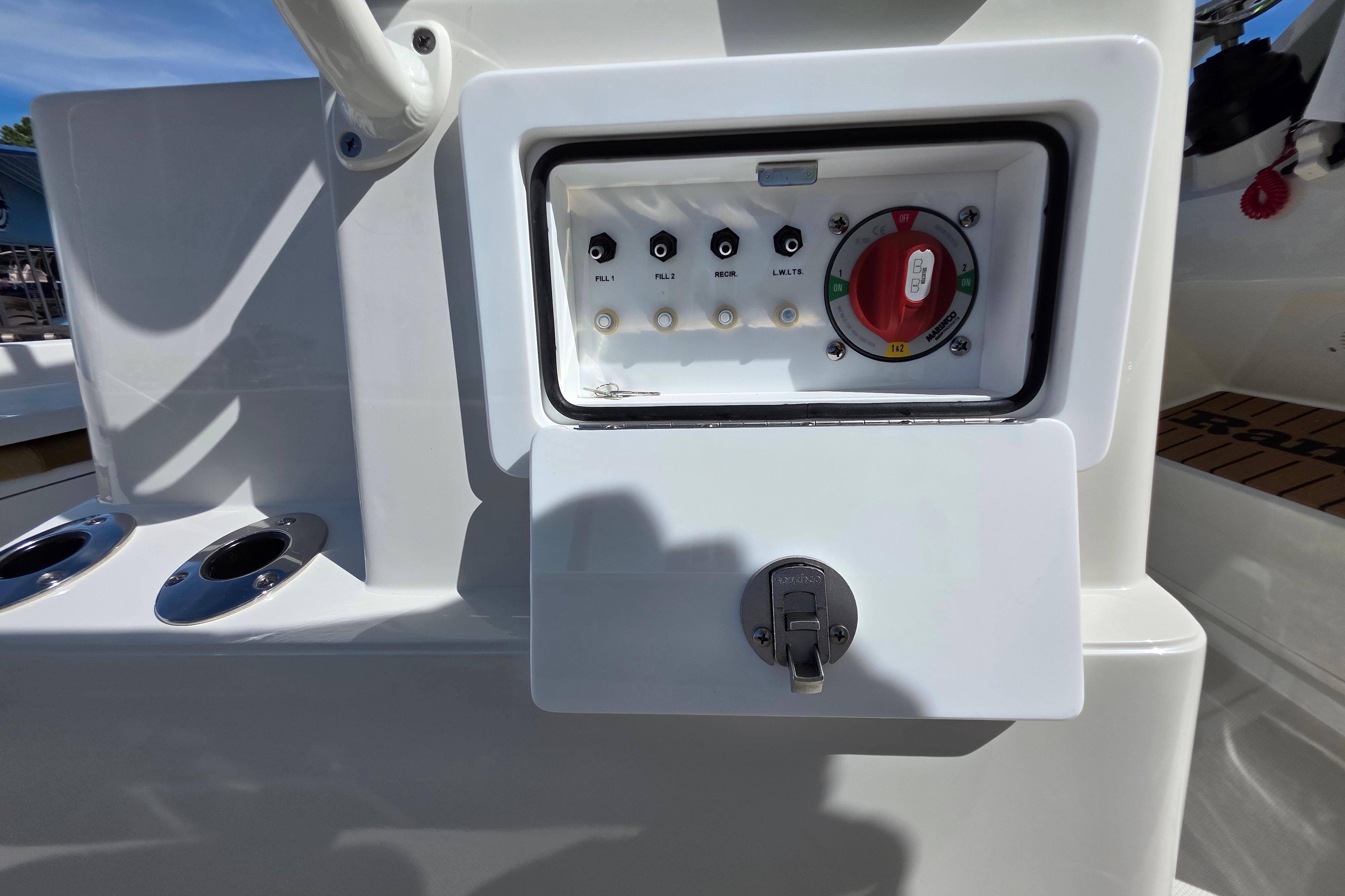 Custom-fitted premium marine upholstery: leaning post w/ 40 gal. baitwell & added storage